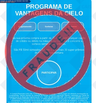 ############################################################################### # !!! ATENCAO !!! ATENCAO !!! ATENCAO !!! ATENCAO !!! ATENCAO !!! ATENCAO !!! # # # # O TEXTO ABAIXO FOI TRANSCRITO A PARTIR DE UMA FRAUDE CADASTRADA EM NOSSOS # # SISTEMAS ATRAVES DA COLETA DE DADOS NA INTERNET E/OU CONTRIBUICAO DE # # PARCEIROS E/OU USUARIOS. # # # # EM CASO DE DUVIDAS ENTRE EM CONTATO ATRAVES DO EMAIL: cais@cais.rnp.br # # # # OBRIGADO. # # # # CENTRO DE ATENDIMENTO A INCIDENTES DE SEGURANCA (CAIS) # # REDE NACIONAL DE ENSINO E PESQUISA (RNP) # ############################################################################### PROGRAMA DE VANTAGENS DA CIELO Regulamento Sorteios Prêmios Na sua próxima compra a partir de 25,00R$ com qualquer cartão de crédito ou débito na máquina da Cielo, você concorre a sorteios semanais de prêmios. São R$ 50mil sorteados durante 1 ano, mais 30 super-prêmios de R$ 25mil toda semana PARTICIPAR A Compra Premiada Cielo não inclui taxas na fatura do cartão. Prêmios pagos em dinheiro diretamento ao contemplado. Valores líquidos de Impostos de Renda, conforme legislação vigente, Lastreados por Títulos de Capitalização da Brasilcap Capitalização S.A., CNPJ 15.138.043/0001-05, aprovados pela SUSEP, Processos nº 19501.002814/2013-61 (cliente Cielo), nº 19501.002831/2013-92 (logistas) e nº 19501.002831/2013-25 (vendedores). A aprovação desses títulos pela SUSEP não implica, por parte da Autarquia, incentivo ou recomendação à sua aquisição, representando, exclusivamente, sua adequação às normas em vigor. Consulte o regulamento no site.