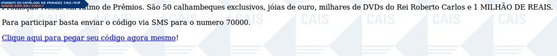 ############################################################################### # !!! ATENCAO !!! ATENCAO !!! ATENCAO !!! ATENCAO !!! ATENCAO !!! ATENCAO !!! # # # # O TEXTO ABAIXO FOI TRANSCRITO A PARTIR DE UMA FRAUDE CADASTRADA EM NOSSOS # # SISTEMAS ATRAVES DA COLETA DE DADOS NA INTERNET E/OU CONTRIBUICAO DE # # PARCEIROS E/OU USUARIOS. # # # # EM CASO DE DUVIDAS ENTRE EM CONTATO ATRAVES DO EMAIL: cais@cais.rnp.br # # # # OBRIGADO. # # # # CENTRO DE ATENDIMENTO A INCIDENTES DE SEGURANCA (CAIS) # # REDE NACIONAL DE ENSINO E PESQUISA (RNP) # ############################################################################### Promoção Nestlé em Ritmo de Prêmios. São 50 calhambeques exclusivos, jóias de ouro, milhares de DVDs do Rei Roberto Carlos e 1 MILHÃO DE REAIS. Para participar basta enviar o código via SMS para o numero 70000. Clique aqui para pegar seu código agora mesmo!