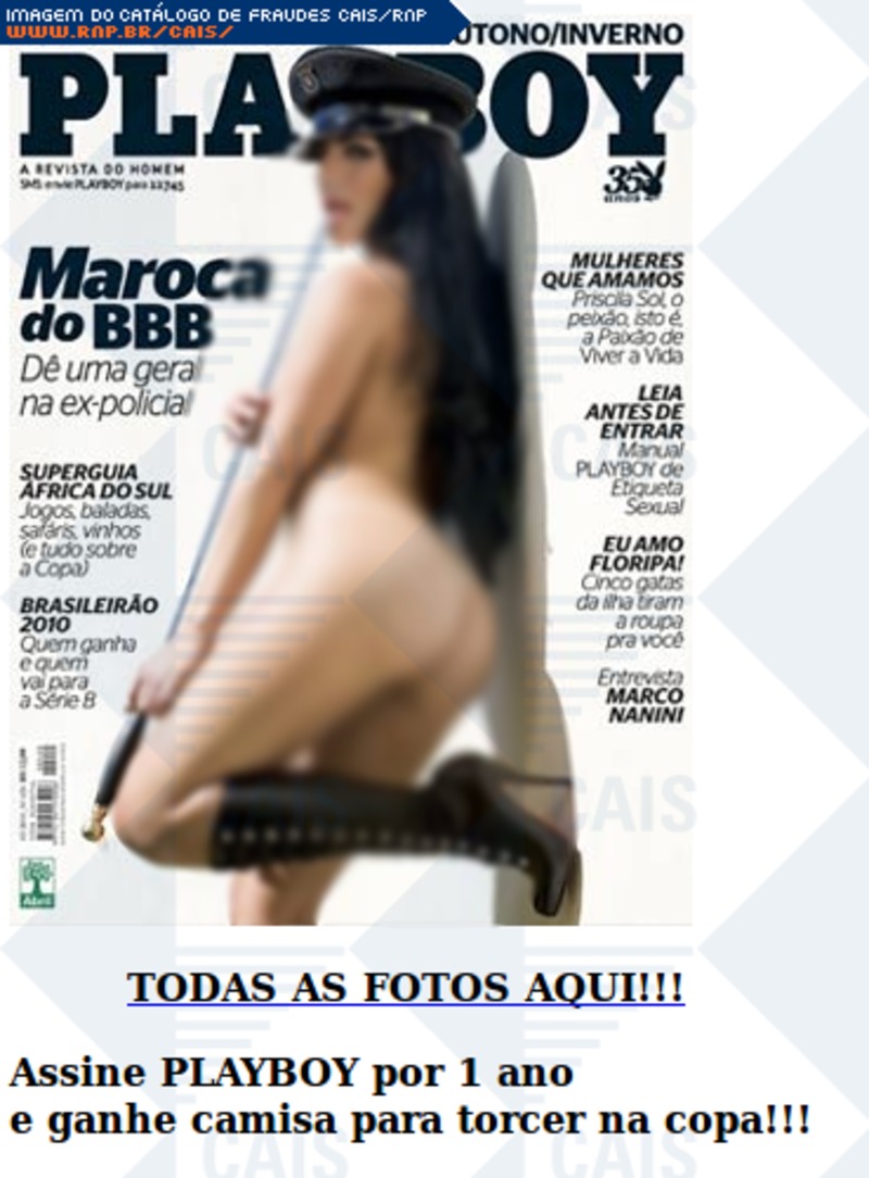 Fraude contendo uma imagem que seria da capa da revista Playboy de maio/2010 e um link para todas as fotos do ensaio principal. O link leva a um malware já retirado da página no momento da análise.