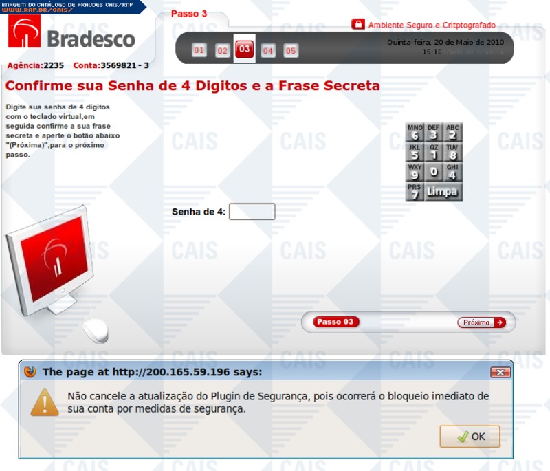 ############################################################################### # !!! ATENCAO !!! ATENCAO !!! ATENCAO !!! ATENCAO !!! ATENCAO !!! ATENCAO !!! # # # # O TEXTO ABAIXO FOI TRANSCRITO A PARTIR DE UMA FRAUDE CADASTRADA EM NOSSOS # # SISTEMAS ATRAVES DA COLETA DE DADOS NA INTERNET E/OU CONTRIBUICAO DE # # PARCEIROS E/OU USUARIOS. # # # # EM CASO DE DUVIDAS ENTRE EM CONTATO ATRAVES DO EMAIL: cais@cais.rnp.br # # # # OBRIGADO. # # # # CENTRO DE ATENDIMENTO A INCIDENTES DE SEGURANCA (CAIS) # # REDE NACIONAL DE ENSINO E PESQUISA (RNP) # ############################################################################### Prezado Cliente, Por motivos de segurança comunicamos a todos os clientes que, visando barrar o constante aumento de fraudes no Internet Banking Bradesco será obrigatório realizar a Atualizacao das Tabela, evitando assim a suspensao da senha de 6 Digitos do cartao. Clique no botao abaixo pra atualizar. é Simples, Rapido e Facil. MailScanner ha detectado un posible intento de fraude desde "83.147.200.113" Atenção: A Atualização obrigatória é de responsabilidade do cliente. O Banco Bradesco S/A não se responsabilizará por danos sofridos caso as chaves não sejam atualizadas.