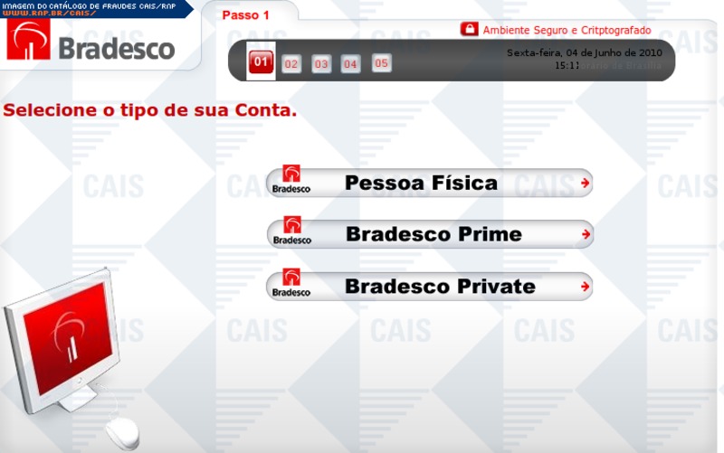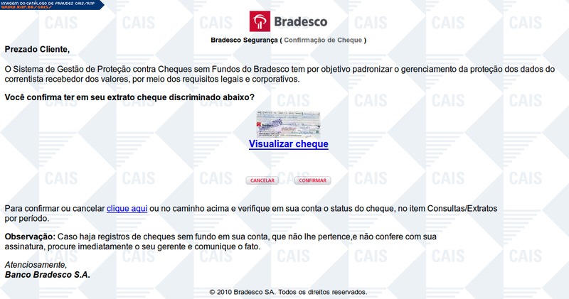 Mensagem se passando por notificação do Banco Bradesco sobre cheque sem fundo emitido pela vítima. A fraude fornece uma imagem em miniatura de um cheque Bradesco, e dois butões que confirmariam ou não que a vítima emitiu o cheque. Há ainda um link que permitiria ampliar a imagem do cheque. Tais links levam a uma página falsa destinada a roubar dados confiidenciais de acesso à conta da vítima.
