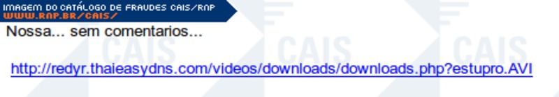 Mensagem fraudulenta contendo link para suposto vídeo que moestraria garota sendo drogada e estuprada. O link leva a um malware identificado como Trojan.Generic.KD.17047 (BitDefender).