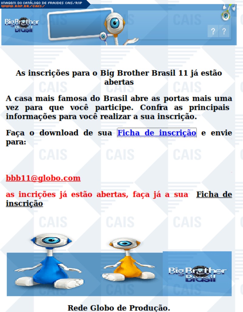 ############################################################################### # !!! ATENCAO !!! ATENCAO !!! ATENCAO !!! ATENCAO !!! ATENCAO !!! ATENCAO !!! # # # # O TEXTO ABAIXO FOI TRANSCRITO A PARTIR DE UMA FRAUDE CADASTRADA EM NOSSOS # # SISTEMAS ATRAVES DA COLETA DE DADOS NA INTERNET E/OU CONTRIBUICAO DE # # PARCEIROS E/OU USUARIOS. # # # # EM CASO DE DUVIDAS ENTRE EM CONTATO ATRAVES DO EMAIL: cais@cais.rnp.br # # # # OBRIGADO. # # # # CENTRO DE ATENDIMENTO A INCIDENTES DE SEGURANCA (CAIS) # # REDE NACIONAL DE ENSINO E PESQUISA (RNP) # ############################################################################### As inscrições para o Big Brother Brasil 11 já estão abertas A casa mais famosa do Brasil abre as portas mais uma vez para que você participe. Confira as principais informações para você realizar a sua inscrição. Faça o download de sua Ficha de inscrição e envie para: bbb11@globo.com as incrições já estão abertas, faça já a sua Ficha de inscrição Rede Globo de Produção.
