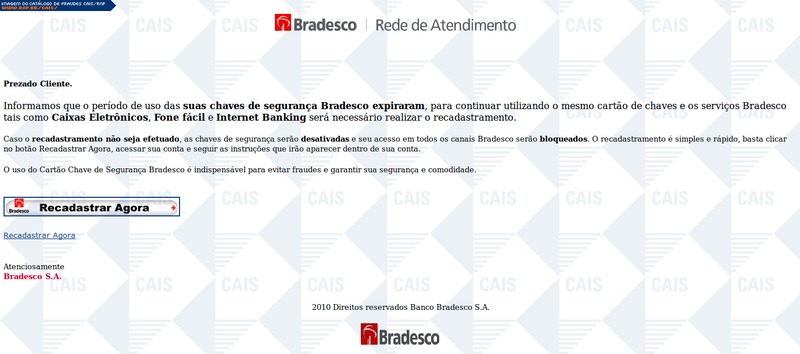 ############################################################################### # !!! ATENCAO !!! ATENCAO !!! ATENCAO !!! ATENCAO !!! ATENCAO !!! ATENCAO !!! # # # # O TEXTO ABAIXO FOI TRANSCRITO A PARTIR DE UMA FRAUDE CADASTRADA EM NOSSOS # # SISTEMAS ATRAVES DA COLETA DE DADOS NA INTERNET E/OU CONTRIBUICAO DE # # PARCEIROS E/OU USUARIOS. # # # # EM CASO DE DUVIDAS ENTRE EM CONTATO ATRAVES DO EMAIL: cais@cais.rnp.br # # # # OBRIGADO. # # # # CENTRO DE ATENDIMENTO A INCIDENTES DE SEGURANCA (CAIS) # # REDE NACIONAL DE ENSINO E PESQUISA (RNP) # ############################################################################### Prezado Cliente. Informamos que o período de uso das suas chaves de segurança Bradesco expiraram, para continuar utilizando o mesmo cartão de chaves e os serviços Bradesco tais como Caixas Eletrônicos, Fone fácil e Internet Banking será necessário realizar o recadastramento. Caso o recadastramento não seja efetuado, as chaves de segurança serão desativadas e seu acesso em todos os canais Bradesco serão bloqueados. O recadastramento é simples e rápido, basta clicar no botão Recadastrar Agora, acessar sua conta e seguir as instruções que irão aparecer dentro de sua conta. O uso do Cartão Chave de Segurança Bradesco é indispensável para evitar fraudes e garantir sua segurança e comodidade. [] Recadastrar Agora Atenciosamente Bradesco S.A. 2010 Direitos reservados Banco Bradesco S.A. []
