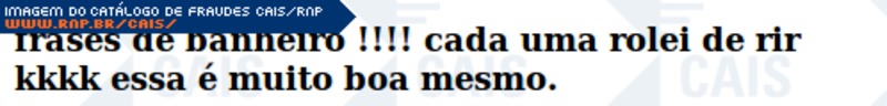 ############################################################################### # !!! ATENCAO !!! ATENCAO !!! ATENCAO !!! ATENCAO !!! ATENCAO !!! ATENCAO !!! # # # # O TEXTO ABAIXO FOI TRANSCRITO A PARTIR DE UMA FRAUDE CADASTRADA EM NOSSOS # # SISTEMAS ATRAVES DA COLETA DE DADOS NA INTERNET E/OU CONTRIBUICAO DE # # PARCEIROS E/OU USUARIOS. # # # # EM CASO DE DUVIDAS ENTRE EM CONTATO ATRAVES DO EMAIL: cais@cais.rnp.br # # # # OBRIGADO. # # # # CENTRO DE ATENDIMENTO A INCIDENTES DE SEGURANCA (CAIS) # # REDE NACIONAL DE ENSINO E PESQUISA (RNP) # ############################################################################### frases de banheiro !!!! cada uma rolei de rir kkkk essa é muito boa mesmo.