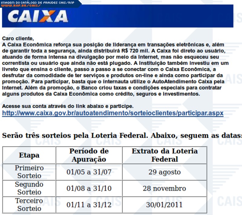 ############################################################################### # !!! ATENCAO !!! ATENCAO !!! ATENCAO !!! ATENCAO !!! ATENCAO !!! ATENCAO !!! # # # # O TEXTO ABAIXO FOI TRANSCRITO A PARTIR DE UMA FRAUDE CADASTRADA EM NOSSOS # # SISTEMAS ATRAVES DA COLETA DE DADOS NA INTERNET E/OU CONTRIBUICAO DE # # PARCEIROS E/OU USUARIOS. # # # # EM CASO DE DUVIDAS ENTRE EM CONTATO ATRAVES DO EMAIL: cais@cais.rnp.br # # # # OBRIGADO. # # # # CENTRO DE ATENDIMENTO A INCIDENTES DE SEGURANCA (CAIS) # # REDE NACIONAL DE ENSINO E PESQUISA (RNP) # ############################################################################### Caro cliente, A Caixa Econômica reforça sua posição de liderança em transações eletrônicas e, além de garantir toda a segurança, ainda distribuirá R$ 720 mil. A Caixa foi direto ao usuário, atuando de forma intensa na divulgação por meio da Internet, mas não esqueceu seu correntista ou usuário que ainda não está plugado. A Instituição também investiu em um livreto que ensina o cliente, passo a passo a se conectar com o Caixa Econômica, a desfrutar da comodidade de ter serviços e produtos on-line e ainda como participar da promoção. Para participar, basta que o internauta utilize o AutoAtendimento Caixa pela Internet. Além da promoção, o Banco criou taxas e condições especiais para contratar alguns produtos da Caixa Econômica como crédito, seguros e investimentos. Acesse sua conta através do link abaixo e participe. http://www.caixa.gov.br/autoatendimento/sorteioclientes/participar.aspx Serão três sorteios pela Loteria Federal. Abaixo, seguem as datas: Etapa Período de Apuração Extrato da Loteria Federal Primeiro Sorteio 01/05 a 31/07 29 agosto Segundo Sorteio 01/08 a 31/10 28 novembro Terceiro Sorteio 01/11 a 31/12 30/01/2011