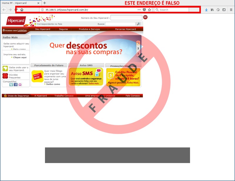 A vítima recebe uma mensagem informando que seu cartão HiperCard encontra-se bloqueado devido a decorrência de fraudes, sendo necessário realizar o desbloqueio no link disponível, entretanto a página é falsa criada para roubar os dados bancários do usuário.