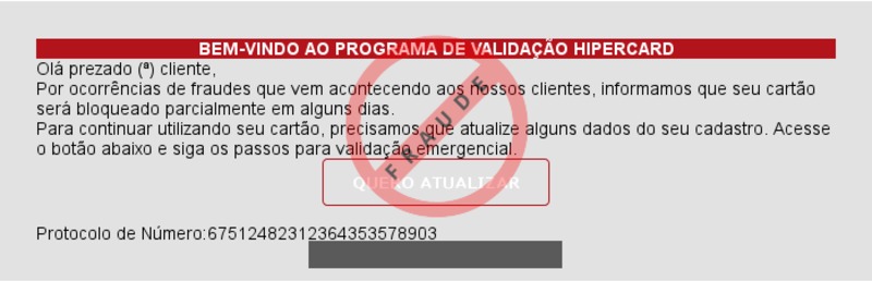 ############################################################################### # !!! ATENCAO !!! ATENCAO !!! ATENCAO !!! ATENCAO !!! ATENCAO !!! ATENCAO !!! # # # # O TEXTO ABAIXO FOI TRANSCRITO A PARTIR DE UMA FRAUDE CADASTRADA EM NOSSOS # # SISTEMAS ATRAVES DA COLETA DE DADOS NA INTERNET E/OU CONTRIBUICAO DE # # PARCEIROS E/OU USUARIOS. # # # # EM CASO DE DUVIDAS ENTRE EM CONTATO ATRAVES DO EMAIL: cais@cais.rnp.br # # # # OBRIGADO. # # # # CENTRO DE ATENDIMENTO A INCIDENTES DE SEGURANCA (CAIS) # # REDE NACIONAL DE ENSINO E PESQUISA (RNP) # ############################################################################### BEM-VINDO AO PROGRAMA DE VALIDAÇÃO HIPERCARD Olá prezado (ª) cliente, Por ocorrências de fraudes que vem acontecendo aos nossos clientes, informamos que seu cartão será bloqueado parcialmente em alguns dias. Para continuar utilizando seu cartão, precisamos que atualize alguns dados do seu cadastro. Acesse o botão abaixo e siga os passos para validação emergencial. QUERO ATUALIZAR Protocolo de Número:67512482312364353578903