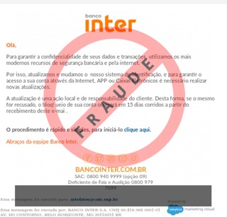 ############################################################################### # !!! ATENCAO !!! ATENCAO !!! ATENCAO !!! ATENCAO !!! ATENCAO !!! ATENCAO !!! # # # # O TEXTO ABAIXO FOI TRANSCRITO A PARTIR DE UMA FRAUDE CADASTRADA EM NOSSOS # # SISTEMAS ATRAVES DA COLETA DE DADOS NA INTERNET E/OU CONTRIBUICAO DE # # PARCEIROS E/OU USUARIOS. # # # # EM CASO DE DUVIDAS ENTRE EM CONTATO ATRAVES DO EMAIL: cais@cais.rnp.br # # # # OBRIGADO. # # # # CENTRO DE ATENDIMENTO A INCIDENTES DE SEGURANCA (CAIS) # # REDE NACIONAL DE ENSINO E PESQUISA (RNP) # ############################################################################### Banco Inter Olá, Para garantir a confidencialidade de seus dados e transações, utilizamos os mais modernos recursos de segurança bancária e pela internet. Por isso, atualizamos e mudamos o nosso sistema de identificação, e para garantir o acesso a sua conta através da Internet, APP ou Caixas Eletrônicos é necessário realizar novas atualizações. A atualização é uma ação local e de responsabilidade do cliente. Desta forma, se o mesmo for recusado, o bloq! ueio de sua conta ocorrerá em 15 dias corridos a partir do recebimento deste e-mai . O procedimento é rápido e simples, para iniciá-lo clique aqui. Abraços da equipe Banco Inter. Facebook Banco Inter Twitter Banco Inter Instagram Banco Inter Youtube Banco Inter Blog #contacomagente BANCOINTER.COM.BR SAC: 0800 940 9999 (opção 09) Deficiente de Fala e Audição 0800 979 7099 Essa mensagem foi enviada para: artefatos@cais.rnp.br Essa mensagem foi enviada por: BANCO INTER S.A. CNPJ 00.416.968 0001-01 AV. DO CONTORNO, BELO HORIZONTE, MG 30110051 BR