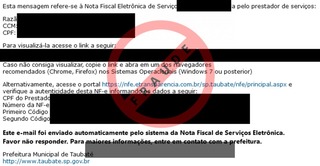############################################################################### # !!! ATENCAO !!! ATENCAO !!! ATENCAO !!! ATENCAO !!! ATENCAO !!! ATENCAO !!! # # # # O TEXTO ABAIXO FOI TRANSCRITO A PARTIR DE UMA FRAUDE CADASTRADA EM NOSSOS # # SISTEMAS ATRAVES DA COLETA DE DADOS NA INTERNET E/OU CONTRIBUICAO DE # # PARCEIROS E/OU USUARIOS. # # # # EM CASO DE DUVIDAS ENTRE EM CONTATO ATRAVES DO EMAIL: cais@cais.rnp.br # # # # OBRIGADO. # # # # CENTRO DE ATENDIMENTO A INCIDENTES DE SEGURANCA (CAIS) # # REDE NACIONAL DE ENSINO E PESQUISA (RNP) # ############################################################################### Esta mensagem refere-se à Nota Fiscal Eletrônica de Serviços No. <numero>emitida pelo prestador de serviços: Razão Social: <razaosocial> CCM: <ccm> CPF: <cpf> Para visualizá-la acesse o link a seguir: https://nfe.etransparencia.com.br/sp.taubate/nfe/stubimprimenfe.aspx?<codigo> Caso não consiga visualizar, copie o link e abra em um dos navegadores recomendados (Chrome, Firefox) nos Sistemas Operacionais (Windows 7 ou posterior) Alternativamente, acesse o portal https://nfe.etransparencia.com.br/sp.taubate/nfe/principal.aspx e verifique a autenticidade desta NF-e informando os dados a seguir: CPF do Prestador: <cpf> Número da NF-e: <numero> Primeiro Código de Verificação: <codigo> Segundo Código de Verificação: <codigo> Este e-mail foi enviado automaticamente pelo sistema da Nota Fiscal de Serviços Eletrônica. Favor não responder. Para maiores informações, entre em contato com a prefeitura. Prefeitura Municipal de Taubaté http://www.taubate.sp.gov.br
