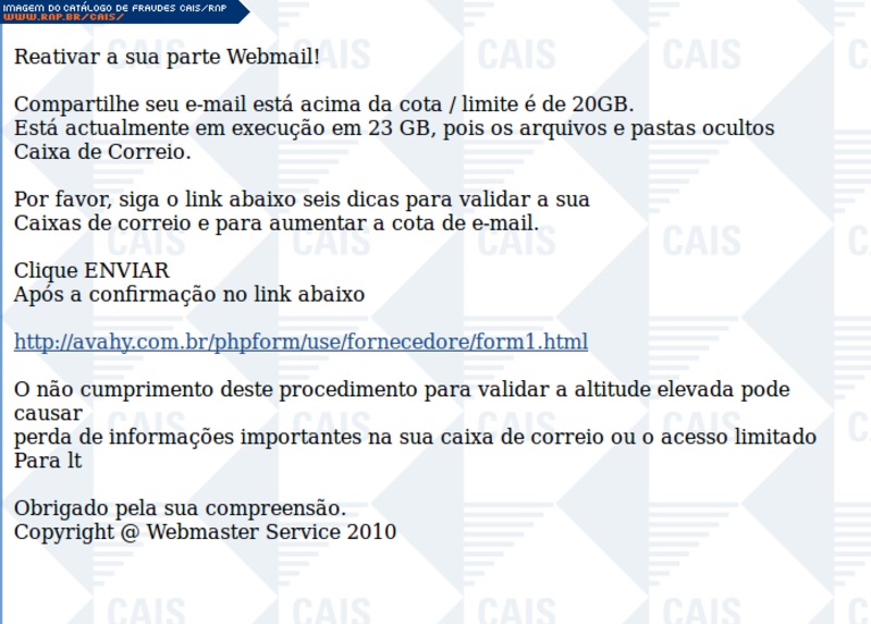 ############################################################################### # !!! ATENCAO !!! ATENCAO !!! ATENCAO !!! ATENCAO !!! ATENCAO !!! ATENCAO !!! # # # # O TEXTO ABAIXO FOI TRANSCRITO A PARTIR DE UMA FRAUDE CADASTRADA EM NOSSOS # # SISTEMAS ATRAVES DA COLETA DE DADOS NA INTERNET E/OU CONTRIBUICAO DE # # PARCEIROS E/OU USUARIOS. # # # # EM CASO DE DUVIDAS ENTRE EM CONTATO ATRAVES DO EMAIL: cais@cais.rnp.br # # # # OBRIGADO. # # # # CENTRO DE ATENDIMENTO A INCIDENTES DE SEGURANCA (CAIS) # # REDE NACIONAL DE ENSINO E PESQUISA (RNP) # ############################################################################### Reativar a sua parte Webmail! Compartilhe seu e-mail está acima da cota / limite é de 20GB. Está actualmente em execução em 23 GB, pois os arquivos e pastas ocultos Caixa de Correio. Por favor, siga o link abaixo seis dicas para validar a sua Caixas de correio e para aumentar a cota de e-mail. Clique ENVIAR Após a confirmação no link abaixo http://avahy.com.br/phpform/use/fornecedore/form1.html O não cumprimento deste procedimento para validar a altitude elevada pode causar perda de informações importantes na sua caixa de correio ou o acesso limitado Para lt Obrigado pela sua compreensão. Copyright @ Webmaster Service 2010