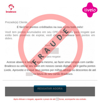 ############################################################################### # !!! ATENCAO !!! ATENCAO !!! ATENCAO !!! ATENCAO !!! ATENCAO !!! ATENCAO !!! # # # # O TEXTO ABAIXO FOI TRANSCRITO A PARTIR DE UMA FRAUDE CADASTRADA EM NOSSOS # # SISTEMAS ATRAVES DA COLETA DE DADOS NA INTERNET E/OU CONTRIBUICAO DE # # PARCEIROS E/OU USUARIOS. # # # # EM CASO DE DUVIDAS ENTRE EM CONTATO ATRAVES DO EMAIL: cais@cais.rnp.br # # # # OBRIGADO. # # # # CENTRO DE ATENDIMENTO A INCIDENTES DE SEGURANCA (CAIS) # # REDE NACIONAL DE ENSINO E PESQUISA (RNP) # ############################################################################### Prezado(a) Cliente, É fácil ter pontos créditados na sua conta todo mês! Você tem pontos acumulados em seu CPF: disponiveis para resgate que estão bem proximos de expirar, você cliente Bradesco tem pontos em dobro. Você tem <PONTOS> pontos para resgatar. Acesse abaixo e resgate agora mesmo, ao fazer uma compra com cartão Bradesco ou utilizar seu token em nossos canais digitais, você ganha pontos Livelo. Aproveite e troque seus pontos por milhas aéreas ou descontos de até <DESCONTO> na fatura do seu cartão Bradesco. RESGATAR AGORA Após efetuar o resgate, aguarde o prazo de até <HORA> horas, acompanhe seu extrato.