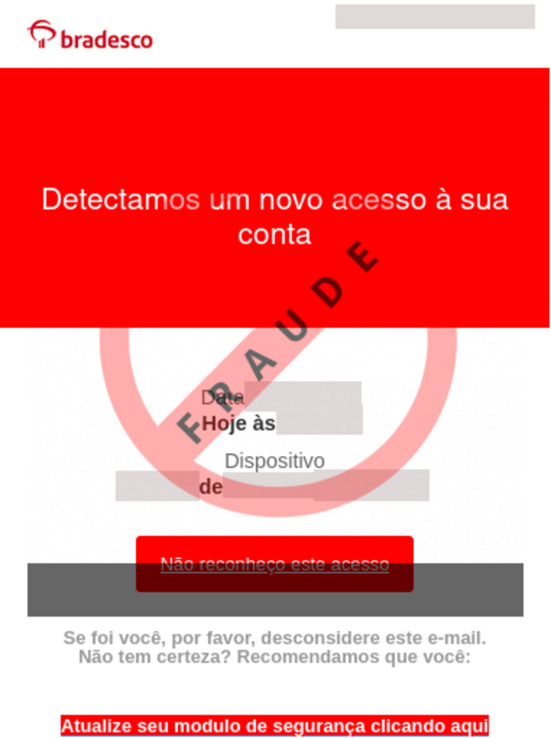 A vítima recebe uma mensagem dizendo que a sua conta do Banco Bradesco foi acessada indevidamente, um link é fornecido para que o usuário sinalize que não reconhece o novo acesso, no entanto, o link direciona o usuário para uma página falsa destinada a roubar as informações bancárias do usuário.