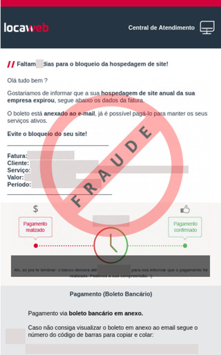 O usuário recebe uma mensagem informando que a hospedagem do seu site no LOCAWEB encontra-se com o pagamento pendente, devendo ser feito na data determinada para evitar o bloqueio. Apesar de o site ser legítimo, trata-se de uma cobrança falsa criada para roubar o dinheiro da vítima.