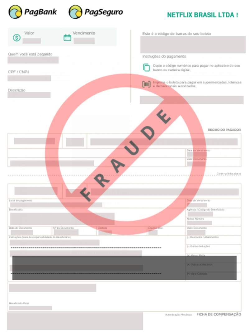 O usuário recebe uma mensagem informando que para continuar utilizando os serviços da Netflix será necessário realizar o pagamento do boleto em anexo, entretanto trata-se de uma falsa cobrança criada para roubar dinheiro da vítima.