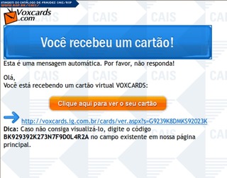 Fraude que se passa por um cartão virtual do site Voxcards. Um link na mensagem que levaria ao cartão direciona a vítima a um software malicioso que não estava mais disponível no momento da análise.