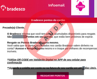 A vítima recebe uma mensagem informando que sua conta no Bradesco está com vários pontos para serem resgatados que estarão expirando em breve, sendo necessário realizar autenticação no link disponibilizado, no entanto, a página é falsa destinada a roubar as informações bancárias do usuário.