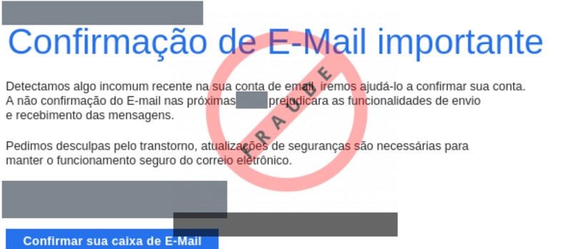 ############################################################################### # !!! ATENCAO !!! ATENCAO !!! ATENCAO !!! ATENCAO !!! ATENCAO !!! ATENCAO !!! # # # # O TEXTO ABAIXO FOI TRANSCRITO A PARTIR DE UMA FRAUDE CADASTRADA EM NOSSOS # # SISTEMAS ATRAVES DA COLETA DE DADOS NA INTERNET E/OU CONTRIBUICAO DE # # PARCEIROS E/OU USUARIOS. # # # # EM CASO DE DUVIDAS ENTRE EM CONTATO ATRAVES DO EMAIL: cais@cais.rnp.br # # # # OBRIGADO. # # # # CENTRO DE ATENDIMENTO A INCIDENTES DE SEGURANCA (CAIS) # # REDE NACIONAL DE ENSINO E PESQUISA (RNP) # ############################################################################### <ID> - <ID> Confirmação de E-Mail importante Detectamos algo incomum recente na sua conta de email, iremos ajudá-lo a confirmar sua conta. A não confirmação do E-mail nas próximas <HORAS> prejudicara as funcionalidades de envio e recebimento das mensagens. Pedimos desculpas pelo transtorno, atualizações de seguranças são necessárias para manter o funcionamento seguro do correio eletrônico. Data: <DIA>, <DATA> <ID> Confirmar sua caixa de E-Mail