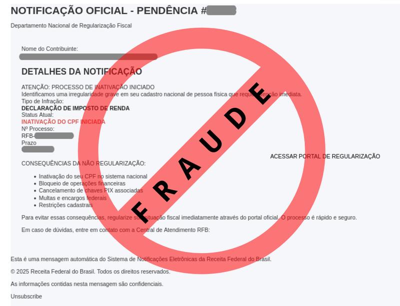 ############################################################################### # !!! ATENCAO !!! ATENCAO !!! ATENCAO !!! ATENCAO !!! ATENCAO !!! ATENCAO !!! # # # # O TEXTO ABAIXO FOI TRANSCRITO A PARTIR DE UMA FRAUDE CADASTRADA EM NOSSOS # # SISTEMAS ATRAVES DA COLETA DE DADOS NA INTERNET E/OU CONTRIBUICAO DE # # PARCEIROS E/OU USUARIOS. # # # # EM CASO DE DUVIDAS ENTRE EM CONTATO ATRAVES DO EMAIL: cais@cais.rnp.br # # # # OBRIGADO. # # # # CENTRO DE ATENDIMENTO A INCIDENTES DE SEGURANCA (CAIS) # # REDE NACIONAL DE ENSINO E PESQUISA (RNP) # ############################################################################### NOTIFICAÇÃO OFICIAL - PENDÊNCIA #<ID> Departamento Nacional de Regularização Fiscal Nome do Contribuinte: <ID> DETALHES DA NOTIFICAÇÃO ATENÇÃO: PROCESSO DE INATIVAÇÃO INICIADO Identificamos uma irregularidade grave em seu cadastro nacional de pessoa física que requer atenção imediata. Tipo de Infração: DECLARAÇÃO DE IMPOSTO DE RENDA Status Atual: INATIVAÇÃO DO CPF INICIADA Nº Processo: <ID> Prazo: <ID> ACESSAR PORTAL DE REGULARIZAÇÃO CONSEQUÊNCIAS DA NÃO REGULARIZAÇÃO: - Inativação do seu CPF no sistema nacional - Bloqueio de operações financeiras - Cancelamento de chaves PIX associadas - Multas e encargos federais - Restrições cadastrais Para evitar essas consequências, regularize sua situação fiscal imediatamente através do portal oficial. O processo é rápido e seguro. Em caso de dúvidas, entre em contato com a Central de Atendimento RFB: Esta é uma mensagem automática do Sistema de Notificações Eletrônicas da Receita Federal do Brasil. © 2025 Receita Federal do Brasil. Todos os direitos reservados. As informações contidas nesta mensagem são confidenciais.