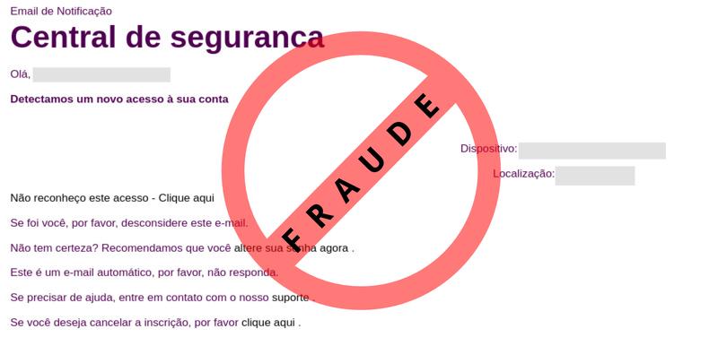 ############################################################################### # !!! ATENCAO !!! ATENCAO !!! ATENCAO !!! ATENCAO !!! ATENCAO !!! ATENCAO !!! # # # # O TEXTO ABAIXO FOI TRANSCRITO A PARTIR DE UMA FRAUDE CADASTRADA EM NOSSOS # # SISTEMAS ATRAVES DA COLETA DE DADOS NA INTERNET E/OU CONTRIBUICAO DE # # PARCEIROS E/OU USUARIOS. # # # # EM CASO DE DUVIDAS ENTRE EM CONTATO ATRAVES DO EMAIL: cais@cais.rnp.br # # # # OBRIGADO. # # # # CENTRO DE ATENDIMENTO A INCIDENTES DE SEGURANCA (CAIS) # # REDE NACIONAL DE ENSINO E PESQUISA (RNP) # ############################################################################### Email de Notificação Central de seguranca Olá, <E-MAIL> Detectamos um novo acesso à sua conta Dispositivo: <NOME> (<DISPOSITIVO>) Localização: <CIDADE> , <PAÍS> Não reconheço este acesso - Clique aqui Se foi você, por favor, desconsidere este e-mail. Não tem certeza? Recomendamos que você altere sua senha agora . Este é um e-mail automático, por favor, não responda. Se precisar de ajuda, entre em contato com o nosso suporte . Se você deseja cancelar a inscrição, por favor clique aqui .