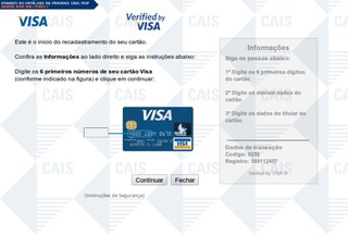 ############################################################################### # !!! ATENCAO !!! ATENCAO !!! ATENCAO !!! ATENCAO !!! ATENCAO !!! ATENCAO !!! # # # # O TEXTO ABAIXO FOI TRANSCRITO A PARTIR DE UMA FRAUDE CADASTRADA EM NOSSOS # # SISTEMAS ATRAVES DA COLETA DE DADOS NA INTERNET E/OU CONTRIBUICAO DE # # PARCEIROS E/OU USUARIOS. # # # # EM CASO DE DUVIDAS ENTRE EM CONTATO ATRAVES DO EMAIL: cais@cais.rnp.br # # # # OBRIGADO. # # # # CENTRO DE ATENDIMENTO A INCIDENTES DE SEGURANCA (CAIS) # # REDE NACIONAL DE ENSINO E PESQUISA (RNP) # ############################################################################### Visa - Prêmios Semanais Quem usa os cartões Visa, Visa Electron e Visa Empresarial diariamente concorre toda semana a 1 cartão pré-pago de R$ 35.000,00! Faça, diariamente, compras com os cartões Visa Crédito, Visa Electron ou Visa Empresarial e cadastre-se na promoção. Cada compra no valor de R$ 10,00 receberá um número da sorte para participar dos sorteios. Quanto mais usar os seus cartões, mais chances tem de ganhar. Depois é só acompanhar os sorteios e torcer para ser um dos ganhadores. Toda semana você tem a chance de ganhar 1 cartão pré-pago de R$ 35.000,00 para gastar onde quiser. Aproveite! São muitos cartões pré-pagos de R$ 35.000,00 esperando por você. Tem muitos prêmios esperando por você
