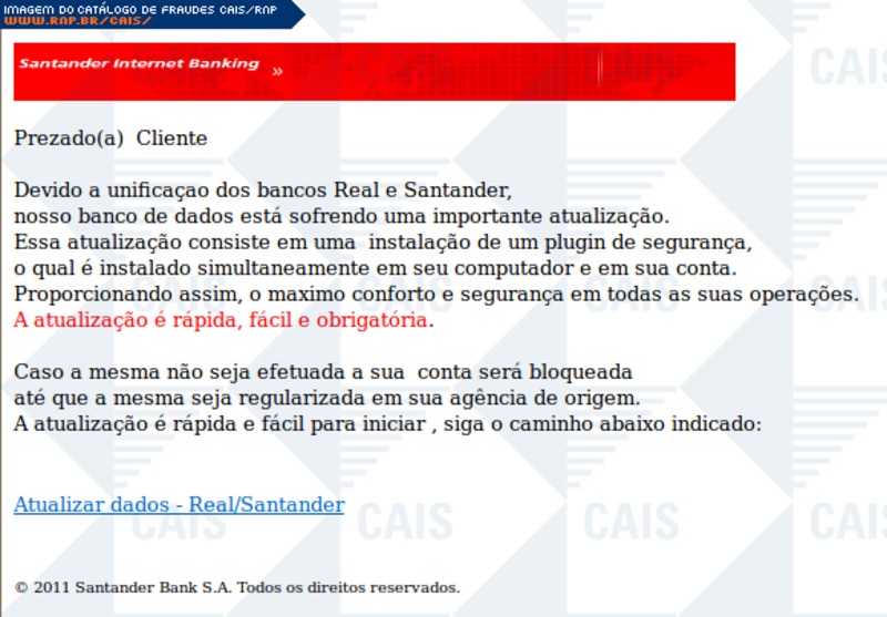 ############################################################################### # !!! ATENCAO !!! ATENCAO !!! ATENCAO !!! ATENCAO !!! ATENCAO !!! ATENCAO !!! # # # # O TEXTO ABAIXO FOI TRANSCRITO A PARTIR DE UMA FRAUDE CADASTRADA EM NOSSOS # # SISTEMAS ATRAVES DA COLETA DE DADOS NA INTERNET E/OU CONTRIBUICAO DE # # PARCEIROS E/OU USUARIOS. # # # # EM CASO DE DUVIDAS ENTRE EM CONTATO ATRAVES DO EMAIL: cais@cais.rnp.br # # # # OBRIGADO. # # # # CENTRO DE ATENDIMENTO A INCIDENTES DE SEGURANCA (CAIS) # # REDE NACIONAL DE ENSINO E PESQUISA (RNP) # ############################################################################### Prezado(a) Cliente Devido a unificaçao dos bancos Real e Santander, nosso banco de dados está sofrendo uma importante atualização. Essa atualização consiste em uma instalação de um plugin de segurança, o qual é instalado simultaneamente em seu computador e em sua conta. Proporcionando assim, o maximo conforto e segurança em todas as suas operações. A atualização é rápida, fácil e obrigatória. Caso a mesma não seja efetuada a sua conta será bloqueada até que a mesma seja regularizada em sua agência de origem. A atualização é rápida e fácil para iniciar , siga o caminho abaixo indicado: Atualizar dados - Real/Santander © 2011 Santander Bank S.A. Todos os direitos reservados.