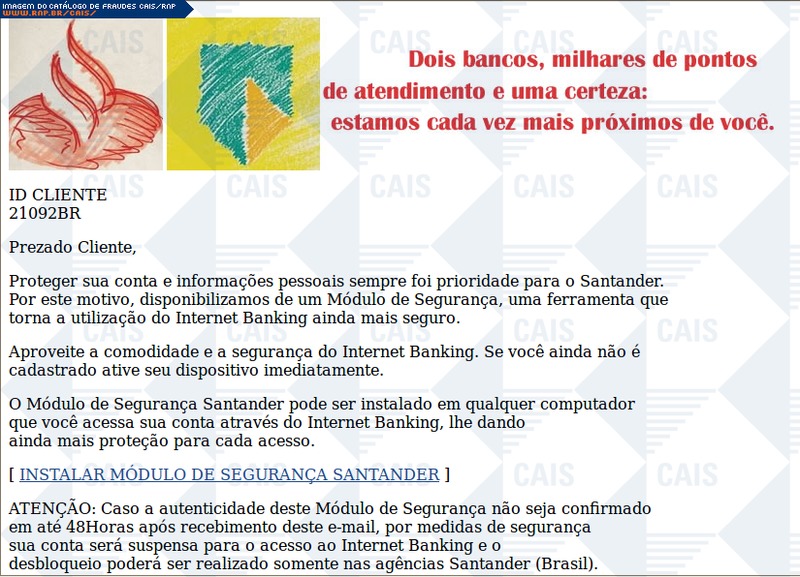 ############################################################################### # !!! ATENCAO !!! ATENCAO !!! ATENCAO !!! ATENCAO !!! ATENCAO !!! ATENCAO !!! # # # # O TEXTO ABAIXO FOI TRANSCRITO A PARTIR DE UMA FRAUDE CADASTRADA EM NOSSOS # # SISTEMAS ATRAVES DA COLETA DE DADOS NA INTERNET E/OU CONTRIBUICAO DE # # PARCEIROS E/OU USUARIOS. # # # # EM CASO DE DUVIDAS ENTRE EM CONTATO ATRAVES DO EMAIL: cais@cais.rnp.br # # # # OBRIGADO. # # # # CENTRO DE ATENDIMENTO A INCIDENTES DE SEGURANCA (CAIS) # # REDE NACIONAL DE ENSINO E PESQUISA (RNP) # ############################################################################### ID CLIENTE 21092BR Prezado Cliente, Proteger sua conta e informações pessoais sempre foi prioridade para o Santander. Por este motivo, disponibilizamos de um Módulo de Segurança, uma ferramenta que torna a utilização do Internet Banking ainda mais seguro. Aproveite a comodidade e a segurança do Internet Banking. Se você ainda não é cadastrado ative seu dispositivo imediatamente. O Módulo de Segurança Santander pode ser instalado em qualquer computador que você acessa sua conta através do Internet Banking, lhe dando ainda mais proteção para cada acesso. [ INSTALAR MÓDULO DE SEGURANÇA SANTANDER ] ATENÇÃO: Caso a autenticidade deste Módulo de Segurança não seja confirmado em até 48Horas após recebimento deste e-mail, por medidas de segurança sua conta será suspensa para o acesso ao Internet Banking e o desbloqueio poderá ser realizado somente nas agências Santander (Brasil).