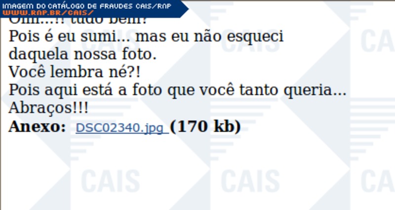 A mensagem, supostamente enviada por um amigo da vítima, contém um link para uma foto. O link leva ao arquivo malicioso que foi identificado como Backdoor.Win32.Rbot (Ikarus).