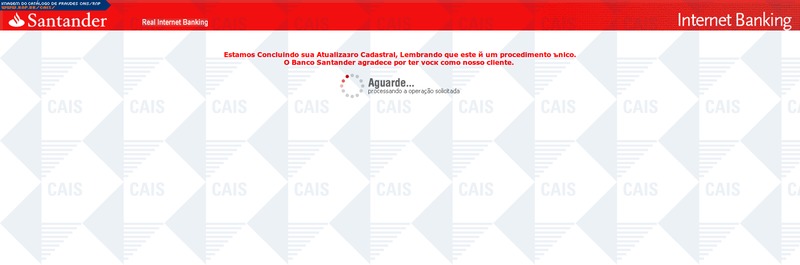 ############################################################################### # !!! ATENCAO !!! ATENCAO !!! ATENCAO !!! ATENCAO !!! ATENCAO !!! ATENCAO !!! # # # # O TEXTO ABAIXO FOI TRANSCRITO A PARTIR DE UMA FRAUDE CADASTRADA EM NOSSOS # # SISTEMAS ATRAVES DA COLETA DE DADOS NA INTERNET E/OU CONTRIBUICAO DE # # PARCEIROS E/OU USUARIOS. # # # # EM CASO DE DUVIDAS ENTRE EM CONTATO ATRAVES DO EMAIL: cais@cais.rnp.br # # # # OBRIGADO. # # # # CENTRO DE ATENDIMENTO A INCIDENTES DE SEGURANCA (CAIS) # # REDE NACIONAL DE ENSINO E PESQUISA (RNP) # ############################################################################### Banco Santander S.A Prezado Cliente, O seu acesso aos serviços Santander Internet Banking encontra-se em Processo de Atualização MOTIVO: Pendência de Seguranca imposta pelo sistema bancário. Aguardando atualização. obs: Lembrando que caso o cliente não realize a atualização, poderá ser efetuado bloqueios/suspensão do serviço. :: Como eu posso evitar a suspensão/bloqueio? Realize sua atualização de acesso no site abaixo. Isso levará apenas alguns minutos. http://www.santander.com/?atualizacao Grupo Santander. Todos direitos reservados Em caso de dúvidas acesse www.santander.com.br