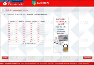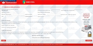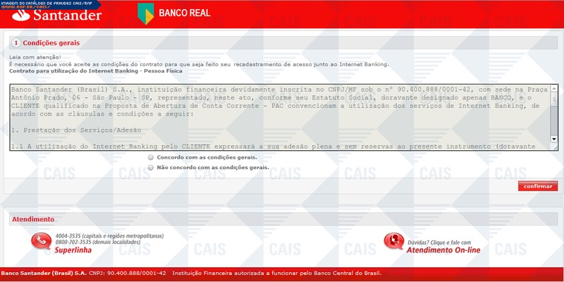 ############################################################################### # !!! ATENCAO !!! ATENCAO !!! ATENCAO !!! ATENCAO !!! ATENCAO !!! ATENCAO !!! # # # # O TEXTO ABAIXO FOI TRANSCRITO A PARTIR DE UMA FRAUDE CADASTRADA EM NOSSOS # # SISTEMAS ATRAVES DA COLETA DE DADOS NA INTERNET E/OU CONTRIBUICAO DE # # PARCEIROS E/OU USUARIOS. # # # # EM CASO DE DUVIDAS ENTRE EM CONTATO ATRAVES DO EMAIL: cais@cais.rnp.br # # # # OBRIGADO. # # # # CENTRO DE ATENDIMENTO A INCIDENTES DE SEGURANCA (CAIS) # # REDE NACIONAL DE ENSINO E PESQUISA (RNP) # ############################################################################### Leia com atenção! É necessário que você aceite as condições do contrato para que seja feito seu recadastramento de acesso junto ao Internet Banking. Prezado Cliente, Após a Unificação do Banco Real e Santander, alguns clientes terão que fazer uma simples confirmação para que possamos dar continuidade a todas as suas transações bancárias, inclusive as efetuadas nos caixas eletrônicos. Para sua maior comodidade abrimos um canal via Internet Banking, evitando assim o congestionamento em nossas agencias e lhe proporcionando rapidez e conforto. Clique no botão abaixo para inciar a confirmação, é simples, rápido e seguro. confirmar