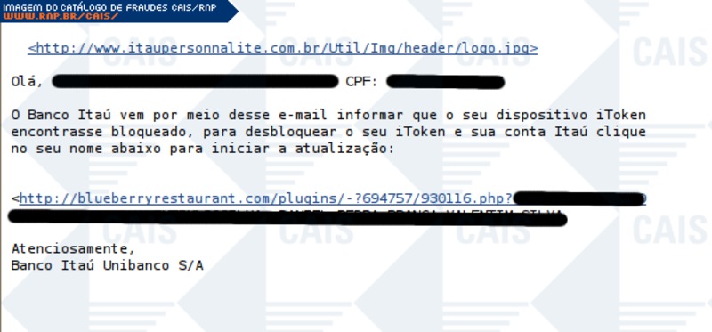 ############################################################################### # !!! ATENCAO !!! ATENCAO !!! ATENCAO !!! ATENCAO !!! ATENCAO !!! ATENCAO !!! # # # # O TEXTO ABAIXO FOI TRANSCRITO A PARTIR DE UMA FRAUDE CADASTRADA EM NOSSOS # # SISTEMAS ATRAVES DA COLETA DE DADOS NA INTERNET E/OU CONTRIBUICAO DE # # PARCEIROS E/OU USUARIOS. # # # # EM CASO DE DUVIDAS ENTRE EM CONTATO ATRAVES DO EMAIL: cais@cais.rnp.br # # # # OBRIGADO. # # # # CENTRO DE ATENDIMENTO A INCIDENTES DE SEGURANCA (CAIS) # # REDE NACIONAL DE ENSINO E PESQUISA (RNP) # ############################################################################### <http://www.itaupersonnalite.com.br/Util/Img/header/logo.jpg> Olá, CPF: O Banco Itaú vem por meio desse e-mail informar que o seu dispositivo iToken encontrasse bloqueado, para desbloquear o seu iToken e sua conta Itaú clique no seu nome abaixo para iniciar a atualização: <http://blueberryrestaurant.com/plugins/-?694757/930116.php? Atenciosamente, Banco Itaú Unibanco S/A