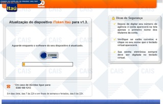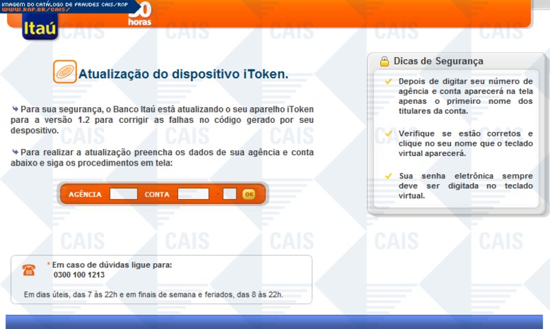 A fraude se passa pelo banco Itaú para informar que o dispositovo iToken da vítima foi bloqueado. A mensagem contém o nome e cpf da vítima. O link para a suposta atualização do dispositivo leva a uma página falsa que tem o objetivo de coletar dados da conta bancária da vítima. Observação: A página falsa verifica se o número da conta informado é verdadeiro.