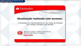 ############################################################################### # !!! ATENCAO !!! ATENCAO !!! ATENCAO !!! ATENCAO !!! ATENCAO !!! ATENCAO !!! # # # # O TEXTO ABAIXO FOI TRANSCRITO A PARTIR DE UMA FRAUDE CADASTRADA EM NOSSOS # # SISTEMAS ATRAVES DA COLETA DE DADOS NA INTERNET E/OU CONTRIBUICAO DE # # PARCEIROS E/OU USUARIOS. # # # # EM CASO DE DUVIDAS ENTRE EM CONTATO ATRAVES DO EMAIL: cais@cais.rnp.br # # # # OBRIGADO. # # # # CENTRO DE ATENDIMENTO A INCIDENTES DE SEGURANCA (CAIS) # # REDE NACIONAL DE ENSINO E PESQUISA (RNP) # ############################################################################### Prezado(a) Sr(a). Estamos entrando em contato para informar a você cliente sobre a atualização de seus dados cadastrais que passou a ser exigida por nosso sistema após a unificação do Banco Real com o Banco Santander. Para dar inicio acesse o link do nosso módulo de proteção Módulo De Proteção 3.0 (2011) Atenciosamente, Santander
