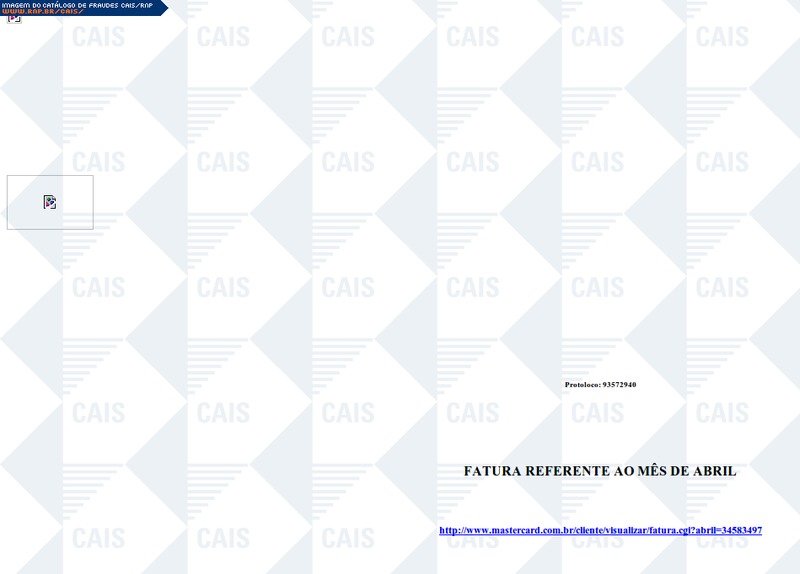############################################################################### # !!! ATENCAO !!! ATENCAO !!! ATENCAO !!! ATENCAO !!! ATENCAO !!! ATENCAO !!! # # # # O TEXTO ABAIXO FOI TRANSCRITO A PARTIR DE UMA FRAUDE CADASTRADA EM NOSSOS # # SISTEMAS ATRAVES DA COLETA DE DADOS NA INTERNET E/OU CONTRIBUICAO DE # # PARCEIROS E/OU USUARIOS. # # # # EM CASO DE DUVIDAS ENTRE EM CONTATO ATRAVES DO EMAIL: cais@cais.rnp.br # # # # OBRIGADO. # # # # CENTRO DE ATENDIMENTO A INCIDENTES DE SEGURANCA (CAIS) # # REDE NACIONAL DE ENSINO E PESQUISA (RNP) # ############################################################################### 12 de Maio de 2011 - 06:43:23 Protoloco: 453590839 Transação Efetuada Com Sucesso. Abaixo segue os dados da transação: Loja: Hipermercado Extra Valor do Pagamento: R$ 450,54 Data do Pagamento: 12/05/2011 ID da Transação: XWW5524418903 Para sua segurança, pedimos que acesse o link abaixo e confirme a vericidade da transação. http://www.mastercard.com.br/extrato/seguranca/visa.com.br/visa/index.html?comprovante=2011 Para cancelar o envio de comprovante por e-mail click aqui © 1996-2011 Mastercard. All Rights Reserved.