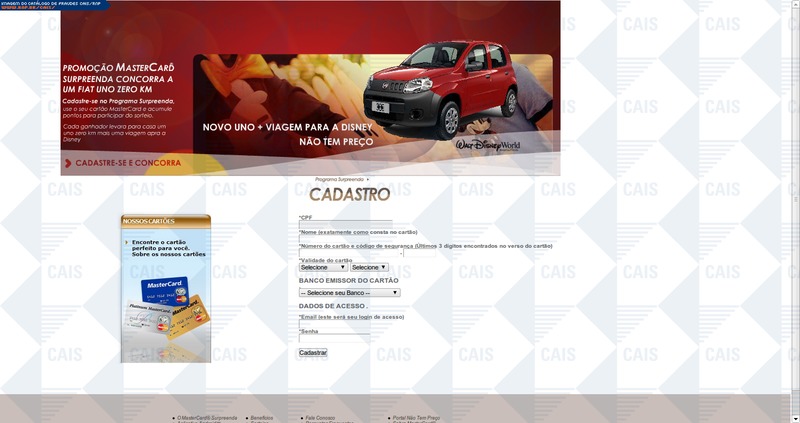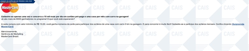 ############################################################################### # !!! ATENCAO !!! ATENCAO !!! ATENCAO !!! ATENCAO !!! ATENCAO !!! ATENCAO !!! # # # # O TEXTO ABAIXO FOI TRANSCRITO A PARTIR DE UMA FRAUDE CADASTRADA EM NOSSOS # # SISTEMAS ATRAVES DA COLETA DE DADOS NA INTERNET E/OU CONTRIBUICAO DE # # PARCEIROS E/OU USUARIOS. # # # # EM CASO DE DUVIDAS ENTRE EM CONTATO ATRAVES DO EMAIL: cais@cais.rnp.br # # # # OBRIGADO. # # # # CENTRO DE ATENDIMENTO A INCIDENTES DE SEGURANCA (CAIS) # # REDE NACIONAL DE ENSINO E PESQUISA (RNP) # ############################################################################### Cadastre-se apenas uma vez e concorra a 10 mil reais por dia em cartões pré-pago e uma casa por mês com carro na garagem! Já são mais de 8000 ganhadores no programa! O que você está esperando? A cada compra com valor mínimo de R$ 10,00, você ganha números da sorte para participar dos sorteios de uma casa com carro 0 km na garagem. E para concorrer é muito fácil! Cadastre-se e participe dos sorteios mensais. Confira clicando |Surpreenda MasterCard| Atenciosamente, Gerência de Marketing MasterCard Brasil.