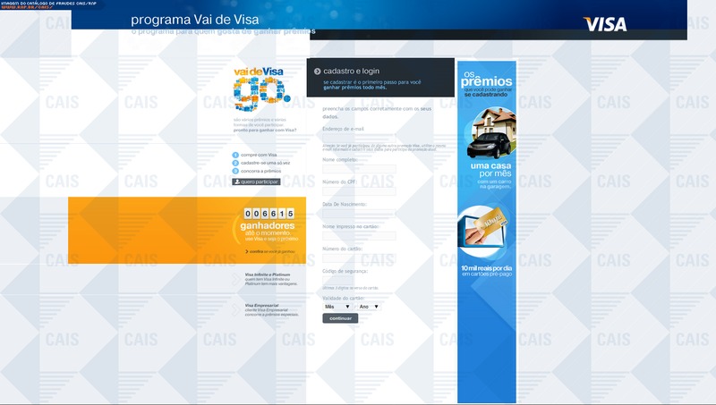 ############################################################################### # !!! ATENCAO !!! ATENCAO !!! ATENCAO !!! ATENCAO !!! ATENCAO !!! ATENCAO !!! # # # # O TEXTO ABAIXO FOI TRANSCRITO A PARTIR DE UMA FRAUDE CADASTRADA EM NOSSOS # # SISTEMAS ATRAVES DA COLETA DE DADOS NA INTERNET E/OU CONTRIBUICAO DE # # PARCEIROS E/OU USUARIOS. # # # # EM CASO DE DUVIDAS ENTRE EM CONTATO ATRAVES DO EMAIL: cais@cais.rnp.br # # # # OBRIGADO. # # # # CENTRO DE ATENDIMENTO A INCIDENTES DE SEGURANCA (CAIS) # # REDE NACIONAL DE ENSINO E PESQUISA (RNP) # ############################################################################### No Programa Vai de Visa você concorre a R$ 10.000,00 por dia e uma casa com carro na garagem por mês. Cliente Visa Cadastre-se na promoção vai de visa e tenha essas vantagens: Nas compras acima de R$ 10,00 com o cartões Visa ou Visa Electron você pode concorrer a: um cartão pré-pago de R$ 10.000,00 por dia. uma casa com carro na garagem por mês. Você não está participando! Aproveite as promoções Visa, quanto mais usar o seu cartão, mais chances tem de ganhar! basta participar.