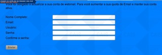 A fraude se passa pelo administrador Webmail que estaria solicitando que a vítima aumente sua cota. A mensagem contém um link que leva a uma página destinada a roubar informações sobre o email da vítima.