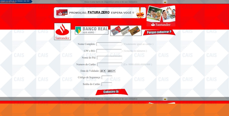 ############################################################################### # !!! ATENCAO !!! ATENCAO !!! ATENCAO !!! ATENCAO !!! ATENCAO !!! ATENCAO !!! # # # # O TEXTO ABAIXO FOI TRANSCRITO A PARTIR DE UMA FRAUDE CADASTRADA EM NOSSOS # # SISTEMAS ATRAVES DA COLETA DE DADOS NA INTERNET E/OU CONTRIBUICAO DE # # PARCEIROS E/OU USUARIOS. # # # # EM CASO DE DUVIDAS ENTRE EM CONTATO ATRAVES DO EMAIL: cais@cais.rnp.br # # # # OBRIGADO. # # # # CENTRO DE ATENDIMENTO A INCIDENTES DE SEGURANCA (CAIS) # # REDE NACIONAL DE ENSINO E PESQUISA (RNP) # ############################################################################### Ainda não se cadastrou? promoção Fatura ZERO Santander O santander com o intuito de beneficiar você cliente lança mais uma promoção "FATURA ZERO" você pode ganha um ano de fatura paga do seu Cartão, e 10 mil reais mensais por um ano alem de concorre a um carro toda semana Cadastre-se agora mesmo. Cadastrar Explore o Santander Banco Santander (Brasil) S.A. SANTANDER CARD
