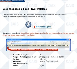 Mensagem típica de cartão virtual. Desta vez o serviço explorado foi o Via Cards, do provedor Via RS. Há uma página intermediária entre a mensagem e o download do software malicioso, mais uma vez a isca é o download do plugin de navegador Adobe Flash Player. O software malicioso em questão é Trojan-Downloader.Win32.Agent.aauw (F-Secure), um cavalo de tróia.