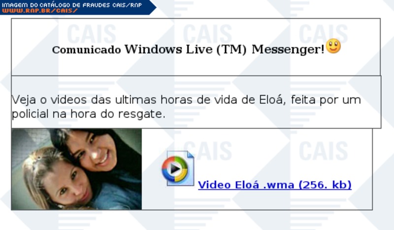Mais uma mensagem que explora o caso Eloá Pimentel. Nesta amostra o usuário recebe um suposto vídeo com cenas das últimas horas de vida da garota. O software malicioso é W32/Packed_RLPack.O (F-Secure).