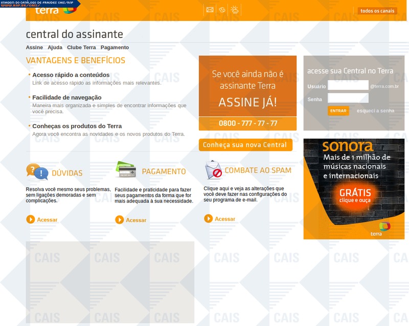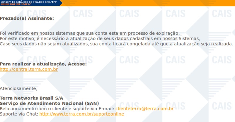 Falsa mensagem em nome do provedor de internet Terra, informa à vítima de que sua conta está em processo de suspensão e portanto, solicita atualização de cadastro. Contudo, o link disponível para tal cadastro leva à uma falsa página da empresa, na qual dados confidenciais são solicitados.