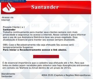 ############################################################################### # !!! ATENCAO !!! ATENCAO !!! ATENCAO !!! ATENCAO !!! ATENCAO !!! ATENCAO !!! # # # # O TEXTO ABAIXO FOI TRANSCRITO A PARTIR DE UMA FRAUDE CADASTRADA EM NOSSOS # # SISTEMAS ATRAVES DA COLETA DE DADOS NA INTERNET E/OU CONTRIBUICAO DE # # PARCEIROS E/OU USUARIOS. # # # # EM CASO DE DUVIDAS ENTRE EM CONTATO ATRAVES DO EMAIL: cais@cais.rnp.br # # # # OBRIGADO. # # # # CENTRO DE ATENDIMENTO A INCIDENTES DE SEGURANCA (CAIS) # # REDE NACIONAL DE ENSINO E PESQUISA (RNP) # ############################################################################### Prezado Cliente ( a ) Santander Trabalha continuamente para manter seus clientes sempre com mais privacidade e segurança no acesso a internet, Nosso contato é para informar que o uso de sua Assinatura Eletrônica teve seu prazo esgotado. Essa atualização é Essencial para manter seu acesso sempre atualizado. OBS: Caso o Recadastramento não seja efetuado Seu acesso será temporariamente Suspenso. Para iniciar o Recadastramento acesse o link abaixo. RECADASTRAR AGORA É de essencial importância que o cadastro seja efetuado até o fim. Para que todos os dados sejam recebidos pelo sistema caso haja divergências entraremos em contato via Telefone ou Email dentro de um prazo de 24 hrs. Atendimento Santander 4004-3535 (Capitais e Regiões Metropolitanas