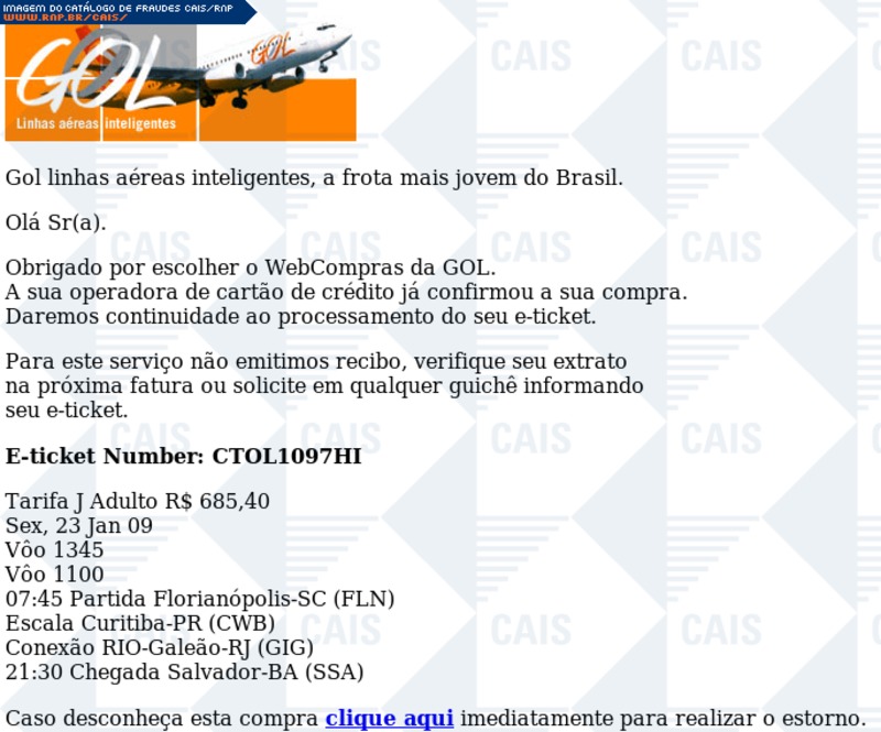 Mensagem que informa a vítima de uma suposta compra, realizada com o seu cartão de crédito, de uma passagem da empresa aérea GOL. A mensagem informa o usuário que para realizar o estorno, deve-se clicar em link que contém um arquivo malicioso identificado pelo F-Secure como Trojan-Downloader.Win32.Zlob.auxj.
