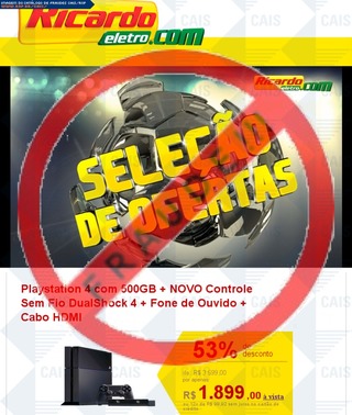 ############################################################################### # !!! ATENCAO !!! ATENCAO !!! ATENCAO !!! ATENCAO !!! ATENCAO !!! ATENCAO !!! # # # # O TEXTO ABAIXO FOI TRANSCRITO A PARTIR DE UMA FRAUDE CADASTRADA EM NOSSOS # # SISTEMAS ATRAVES DA COLETA DE DADOS NA INTERNET E/OU CONTRIBUICAO DE # # PARCEIROS E/OU USUARIOS. # # # # EM CASO DE DUVIDAS ENTRE EM CONTATO ATRAVES DO EMAIL: cais@cais.rnp.br # # # # OBRIGADO. # # # # CENTRO DE ATENDIMENTO A INCIDENTES DE SEGURANCA (CAIS) # # REDE NACIONAL DE ENSINO E PESQUISA (RNP) # ############################################################################### Caso não esteja visualizando as imagens, acesse aqui Para receber nossas ofertas com sucesso, é importante adicionar nosso e-mail, email@ricardoeletro.com.br , em sua lista de contatos. Ricardo Eletro Ricardo Eletro cupom de desconto Playstation 4 com 500GB + NOVO Controle Sem Fio DualShock 4 + Fone de Ouvido + Cabo HDMI 53% de desconto de: R$ 3.599,00 por apenas: R$ 1.899 ,00 à vista ou 12x de R$ 99,92 sem juros no cartão de crédito MacBook Pro Apple com Intel® Core™ i7, Tela 15,4", 8GB de Memória, 256GB de HD, Entrada HDMI, Bluetooth, Leitor de Cartões 79% de desconto de: R$ 9.599,00 por apenas: R$ 2.199 ,00 à vista ou 12x de R$ 70,42 sem juros no cartão de crédito Celular Smartphone Desbloqueado Samsung Galaxy S4 - Android 4.2, Câmera de 13MP, Tela Full HD 5, Quad Core, 4G e WiFi 0 " 35% de desconto de: R$ 1.640,00 por apenas: R$ 1.110 ,00 à vista ou 12x de R$ 54,08 sem juros no cartão de crédito Home Theater Sony 5.1 Full HD com Blu-Ray Player 3D, Função Torcida, NFC e Wi-Fi 43% de desconto de: R$ 2.899,00 por apenas: R$ 1.574 ,00 à vista ou 12x de R$ 79,17 sem juros no cartão de crédito Câmera Profissional Canon EOS Rebel T3i Preta, 18MP, LCD 3,0", Zoom Óptico 3x... 72% de desconto de: R$ 2.999,00 por apenas: R$ 1.099,00 à vista ou 12x de R$ 204,17 sem juros no cartão de crédito Computador PCMix com Processador Intel® Core™ i7, 8GB de Memória, 2000GB de HD + Monitor LED, 24" Widescreen 58% de desconto de: R$ 2.999,00 por apenas: R$ 1.399,00 à vista ou 12x de R$ 92,50 sem juros no cartão de crédito Iphone 4S 8 GB Preto Desbloqueado Apple - iOS7, Câmera 8MP, Tela de 3,5", 3G, Wi-Fi, GPS e MP3 47% de desconto de: R$1.499,00 por apenas: R$ 899,00 à vista ou 12x de R$ 90,00 sem juros no cartão de crédito Xbox One com HD 500GB + NOVO Kinect + Controle Sem Fio + Cabo HDMI + Fone de Ouvido - bivolt 44% de desconto de: R$ 2.299,00 por apenas: R$ 1.339,00 à vista ou 12x de R$ 86,83 sem juros no cartão de crédito iPad Mini com Tela de 7.9", Wi-Fi + 4G Celular, 16GB, Câmera HD 5MP, Chip A5, Branco 49% de desconto de: R$ 1.599,00 por apenas: R$ 899,00 à vista ou 12x de R$ 86,83 sem juros no cartão de crédito TV Plasma Smart 3D 65" Panasonic Full HD com Reconhecimento Facil, Wi-Fi e Câmera Integrados, Conexão HDMI, USB + 2 Óculos 3D Ativos 74% de desconto de: R$ 9.999,00 por apenas: R$ 2.199,00 à vista ou 12x de R$ 86,83 sem juros no cartão de crédito Geladeira Electrolux Frost Free Side by Side 656 Litros Inox 81% de desconto de: R$ 6.199,00 por apenas: R$ 1.029,00 à vista ou 12x de R$ 86,83 sem juros no cartão de crédito Xbox 360 4GB + Kinect c/02 JOGOS + 1 Mês de Assinatura Xbox Live Gold + Controle S/Fio + Battlefield 4 + Cabo HDMI 64% de desconto de: R$ 1.359,00 por apenas: R$ 649,00 à vista ou 12x de R$ 86,83 sem juros no cartão de crédito PlayStation 3 250GB HD + Controle Dual Shock 3 Preto Sem Fio - Produto Oficial Sony - Compacto + 03 Super Jogos! 48% de desconto de: R$ 1.359,00 por apenas: R$ 729,00 à vista ou 12x de R$ 86,83 sem juros no cartão de crédito Ar Condicionado Split Springer 9.000 Btus Frio - Way 48% de desconto de: R$ 1.059,00 por apenas: R$ 649,00 à vista ou 12x de R$ 86,83 sem juros no cartão de crédito voucher promocional Revelação Digital Garantia Estendida Ricardo Eletro Viagens Ricardo Eletro Cursos Online Lista de Casamento saldão Revelação Digital Garantia Estendida Ricardo Eletro viagens Ricardo Eletro Cursos Online Lista de Casamento códigos promocionais confira ainda mais promoções 300 fotos 10x15 Compre sua Passagem Ofertas válidas até o dia 22/01/2014 às 23h59 (horário de Brasília), para as compras feitas pela internet, ou enquanto durarem os estoques (o que ocorrer primeiro). Compre também pelo nosso televendas (0300-313-9000). Central de Atendimento: Tel: 4002-2343 (Capitais e regiões metropolitanas) ? 0xx71 4002-2343 (Demais localidades) Horário de funcionamento: de segunda-feira à sexta-feira, das 09:00h às 19:00h e aos sábados das 09:00h às 15:00h (horário de Brasília), exceto feriados nacionais. Dúvidas? clique aqui Caixa Postal: Rua HUM, FAZENDA CONFISCO, Contagem ? MG, Cep: 32.183-050