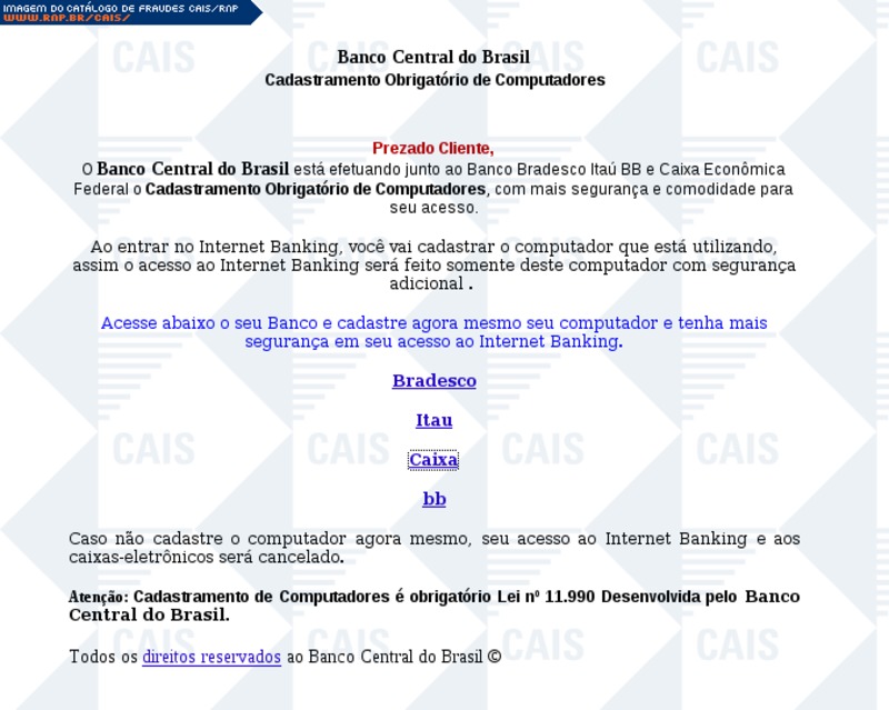 ############################################################################### # !!! ATENCAO !!! ATENCAO !!! ATENCAO !!! ATENCAO !!! ATENCAO !!! ATENCAO !!! # # # # O TEXTO ABAIXO FOI TRANSCRITO A PARTIR DE UMA FRAUDE CADASTRADA EM NOSSOS # # SISTEMAS ATRAVES DA COLETA DE DADOS NA INTERNET E/OU CONTRIBUICAO DE # # PARCEIROS E/OU USUARIOS. # # # # EM CASO DE DUVIDAS ENTRE EM CONTATO ATRAVES DO EMAIL: cais@cais.rnp.br # # # # OBRIGADO. # # # # CENTRO DE ATENDIMENTO A INCIDENTES DE SEGURANCA (CAIS) # # REDE NACIONAL DE ENSINO E PESQUISA (RNP) # ############################################################################### Banco Central do Brasil Cadastramento Obrigatório de Computadores Prezado Cliente, O Banco Central do Brasil está efetuando junto ao Banco Bradesco Itaú BB e Caixa Econômica Federal o Cadastramento Obrigatório de Computadores, com mais segurança e comodidade para seu acesso. Ao entrar no Internet Banking, você vai cadastrar o computador que está utilizando, assim o acesso ao Internet Banking será feito somente deste computador com segurança adicional . Acesse abaixo o seu Banco e cadastre agora mesmo seu computador e tenha mais segurança em seu acesso ao Internet Banking. Bradesco Itau Caixa bb Caso não cadastre o computador agora mesmo, seu acesso ao Internet Banking e aos caixas-eletrônicos será cancelado. Atenção: Cadastramento de Computadores é obrigatório Lei nº 11.990 Desenvolvida pelo Banco Central do Brasil. Todos os direitos reservados ao Banco Central do Brasil ©