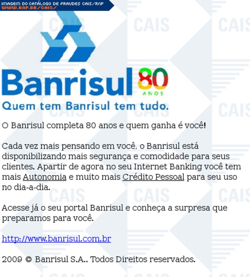 ############################################################################### # !!! ATENCAO !!! ATENCAO !!! ATENCAO !!! ATENCAO !!! ATENCAO !!! ATENCAO !!! # # # # O TEXTO ABAIXO FOI TRANSCRITO A PARTIR DE UMA FRAUDE CADASTRADA EM NOSSOS # # SISTEMAS ATRAVES DA COLETA DE DADOS NA INTERNET E/OU CONTRIBUICAO DE # # PARCEIROS E/OU USUARIOS. # # # # EM CASO DE DUVIDAS ENTRE EM CONTATO ATRAVES DO EMAIL: cais@cais.rnp.br # # # # OBRIGADO. # # # # CENTRO DE ATENDIMENTO A INCIDENTES DE SEGURANCA (CAIS) # # REDE NACIONAL DE ENSINO E PESQUISA (RNP) # ############################################################################### Banrisul S/A. O Banrisul completa 80 anos e quem ganha é você! Cada vez mais pensando em você, o Banrisul está disponibilizando mais segurança e comodidade para seus clientes. Apartir de agora no seu Internet Banking você tem mais Autonomia e muito mais Crédito Pessoal para seu uso no dia-a-dia. Acesse já o seu portal Banrisul e conheça a surpresa que preparamos para você. http://www.banrisul.com.br 2009 © Banrisul S.A.. Todos Direitos reservados.