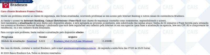 Mensagem falsa se passando por comunicado do Bradesco dizendo que houve um problema nos servidores e que as chaves de segurança da vítima foram perdidas, impossibilitando seu acesso ao Internet Banking. Para corrigir o problema é apresentado um link para o módulo de segurança do banco. O link direciona a vítima para um malware identificado como Packed.Win32.Black.a (F-Secure).